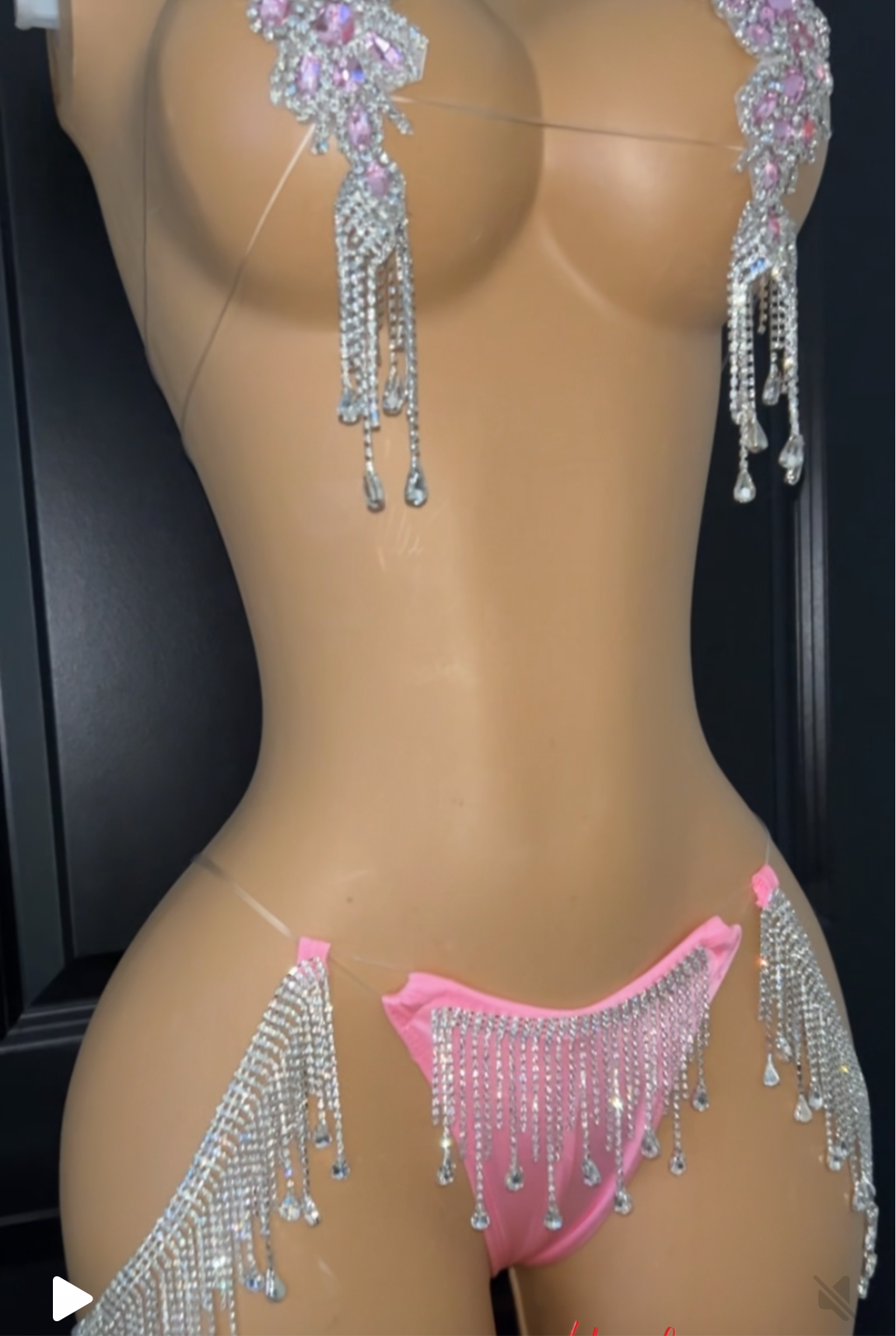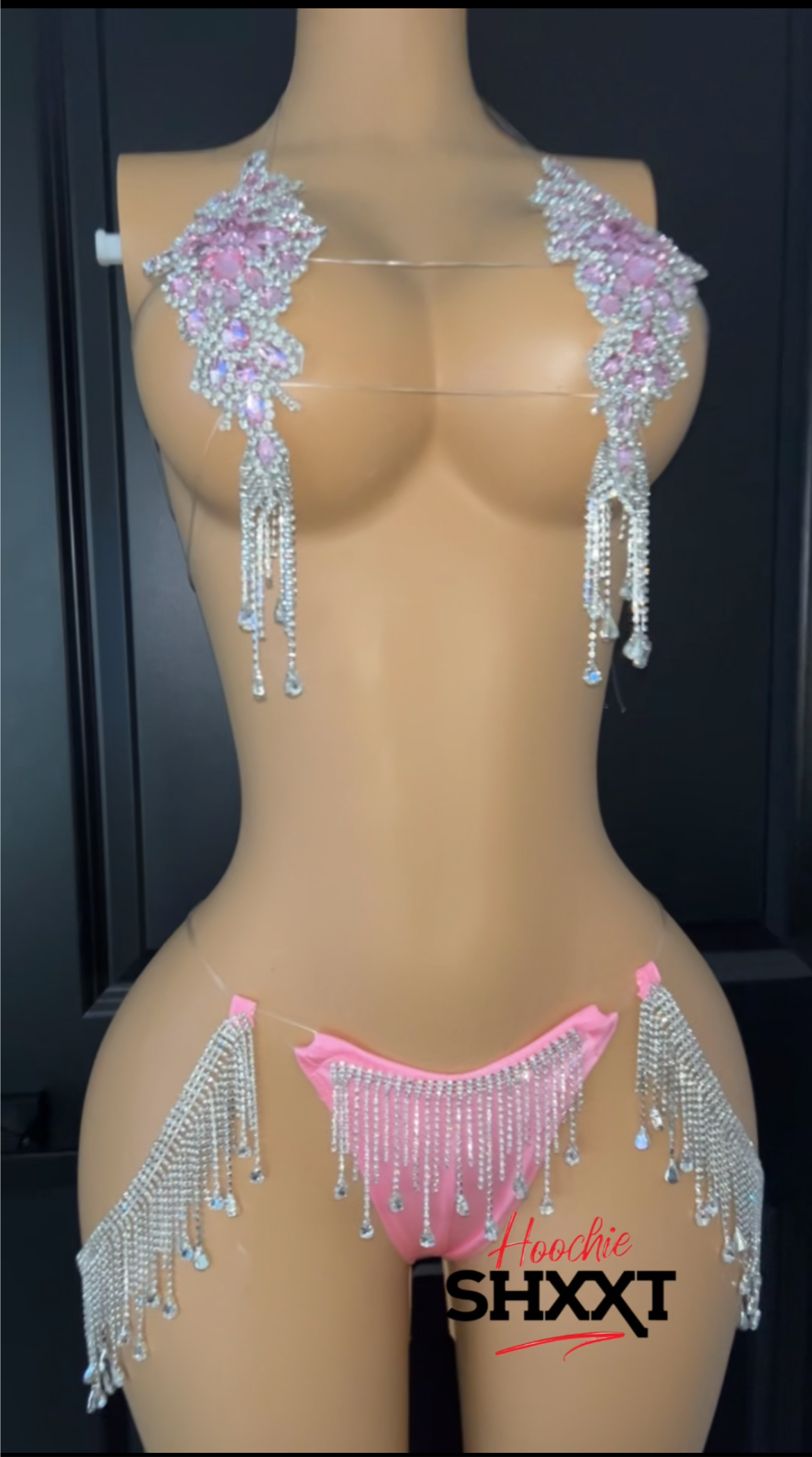 Lux Doll set. This ultra-glam, barely-there design features soft pink fabric paired with crystal-clear straps and shimmering rhinestone fringe that moves with you. Flirty, flashy, and made to be unforgettable — it’s giving doll energy with a high-class twist. Whether it’s for the stage, a private moment, or just because… you’re the prize.